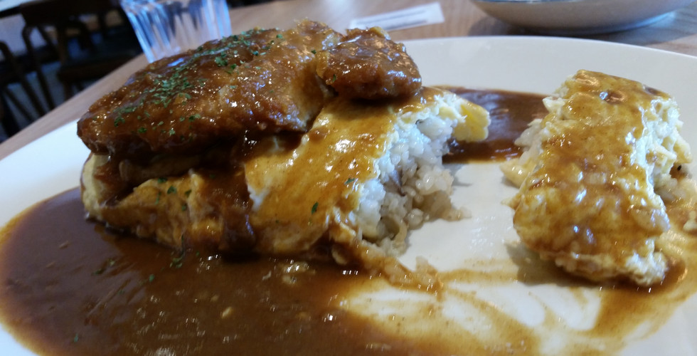 The Omurice came out. It looked damn good. I grabbed my pitch fork and my knife, lined up my cut to execute the perfect Omu-unfolding. A swift laceration to the omelet length wise and….Nothing. No aesthetic draping of runny eggs over my hill of rice. No reaction of what my hopes were so high for. My heart sank. I was so dumbfounded….”Bu…bu…bu…bu…bu….but. The videos all showed…..” I should have realized that all those videos were from no where around here, and Omurice is just an omelette over rice. It is not standardized to have the runny insides that sold me in the first place. But why serve it any other way. Egg porn is half the reason why anyone orders eggs anymore! Bah. Well its not like I’m not going to eat it, and for what it was it was still very good! Rice and eggs are a great combo if you didn’t know, and I thoroughly enjoyed the texture of the rice they used with. It was like an Arborio rice. Firm, and retained a good amount of chew. It came with a pork based gravy and pork chunks too. Very good overall. I would order it again for sure! Just was a little let down to not have it present the way I was expecting it.